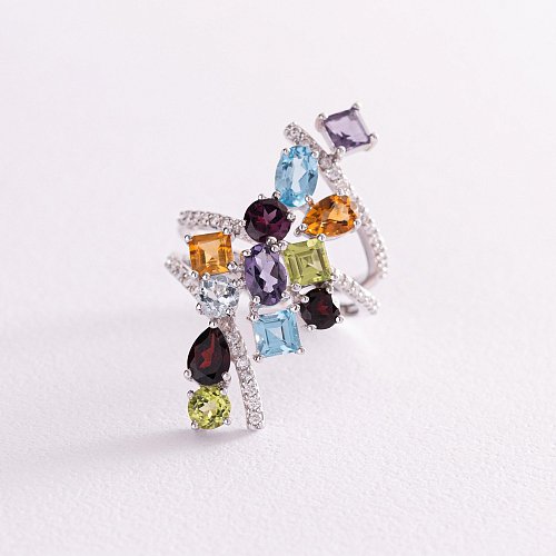 Золотое кольцо (бриллианты, альмандин, аметист, топаз голубой, аквамарин, пироп, цитрин, хризолит) к661A1