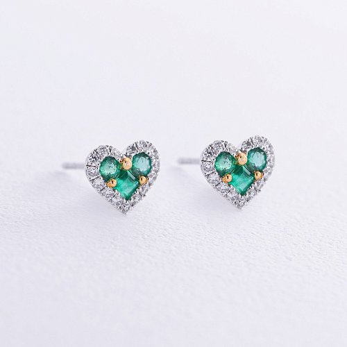 Золотые серьги - пусеты "Сердечки" с изумрудами и бриллиантами сб0522cha