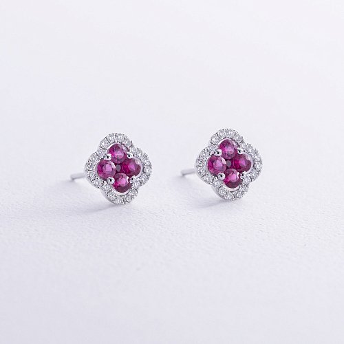 Золотые серьги - пусеты "Клевер" (бриллианты, рубины) сб0521cha