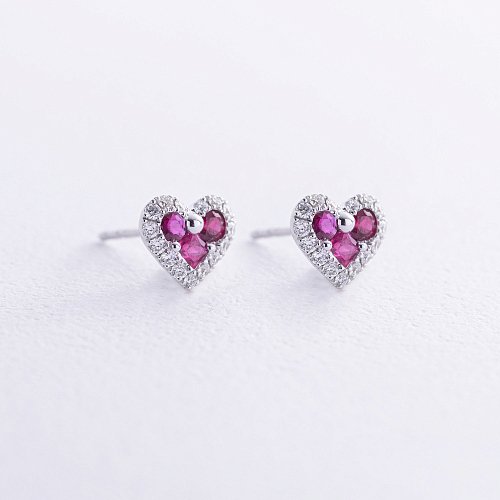 Золотые серьги - пусеты "Сердечки" (бриллианты, рубины) сб0524cha