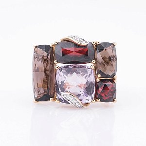 Золотые серьги с камнями (бриллиант, пироп, дымчатый кварц)