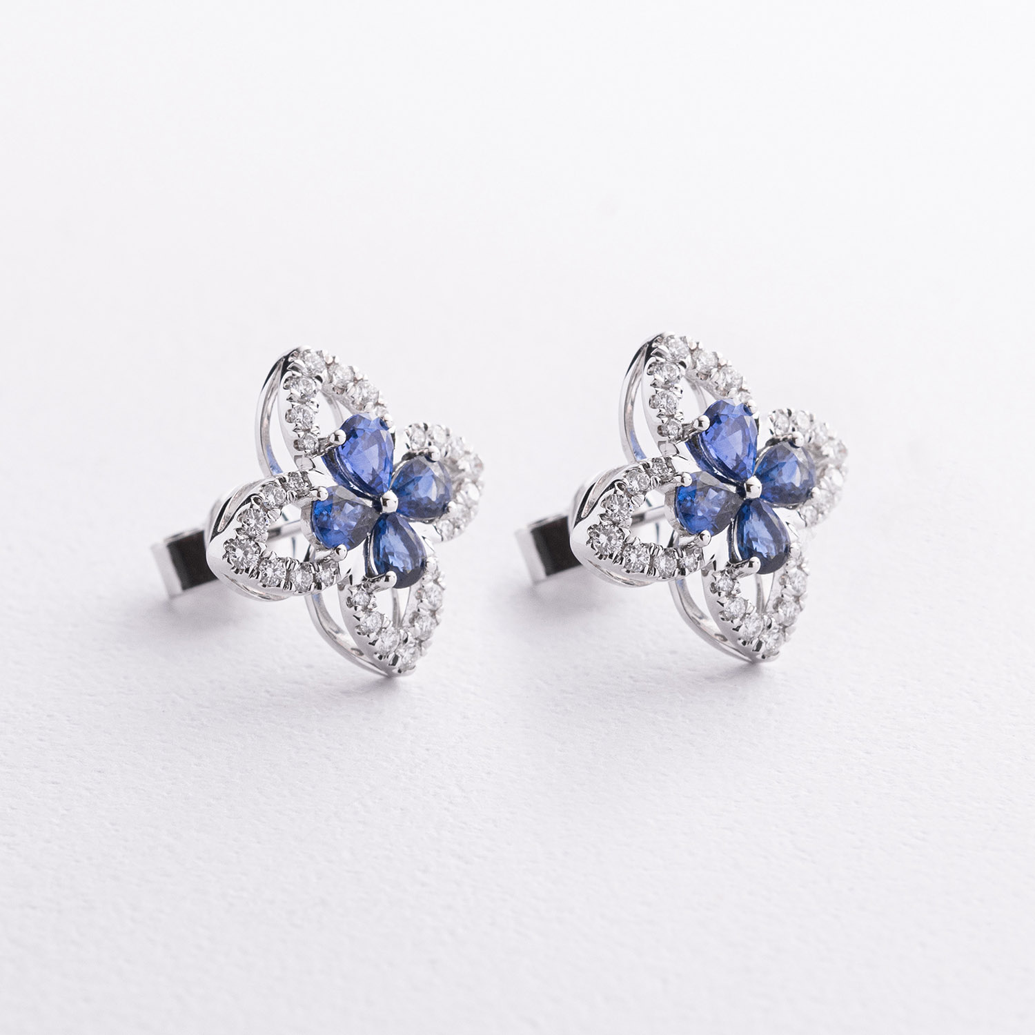 Серьги - пусеты "Клевер" в белом золоте (бриллианты, сапфиры) сб0701sm от ювелирного магазина Оникс - 1