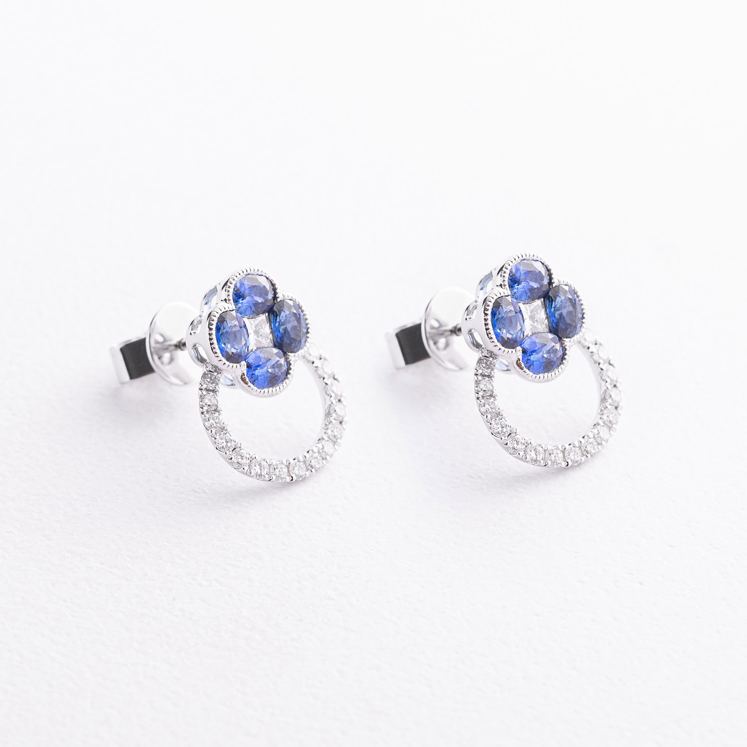 Серьги - пусеты "Клевер" в белом золоте (бриллианты, сапфиры) сб0720lg от ювелирного магазина Оникс - 1