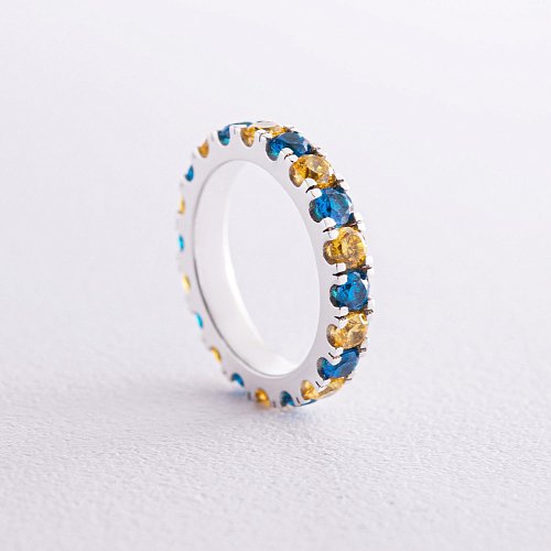 Срібна каблучка з доріжкою блакитного і жовтого каміння 112664