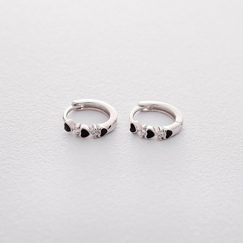 Срібні сережки - кільця з сердечками (емаль, фіаніт) 122455