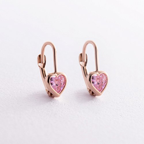 Дитячі золоті сережки "Сердечки" з рожевими фіанітами с08287