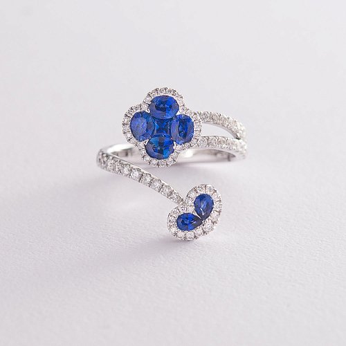 Золота каблучка Конюшина з діамантами і сапфірами R01565mi