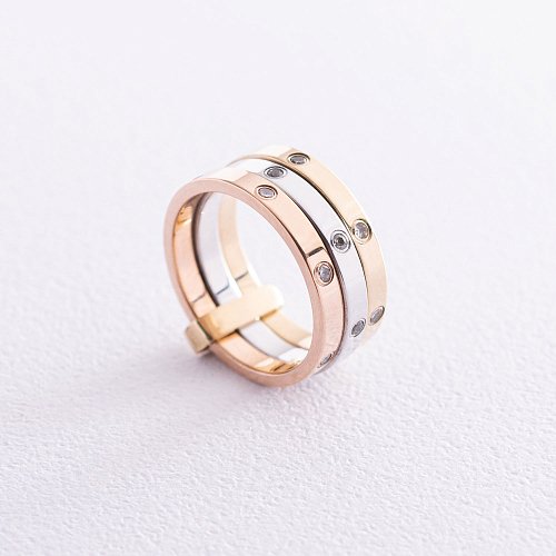 Потрійна жіноча каблучка з білого, червоного і жовтого золота з фіанітами к02205