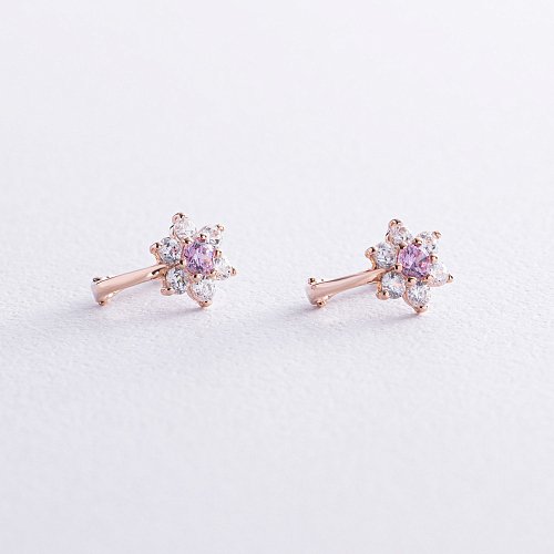 Золоті дитячі сережки "Квіточки" з рожевим фіанітом с03531