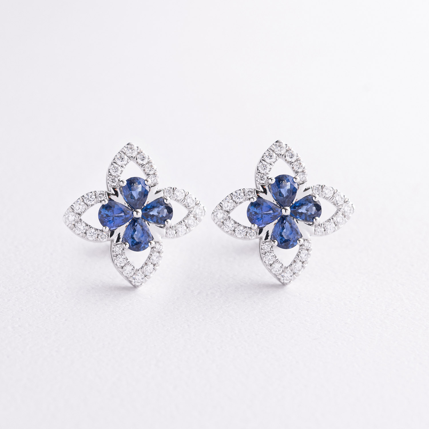 Сережки - пусети "Конюшина" в білому золоті (діаманти, сапфіри)