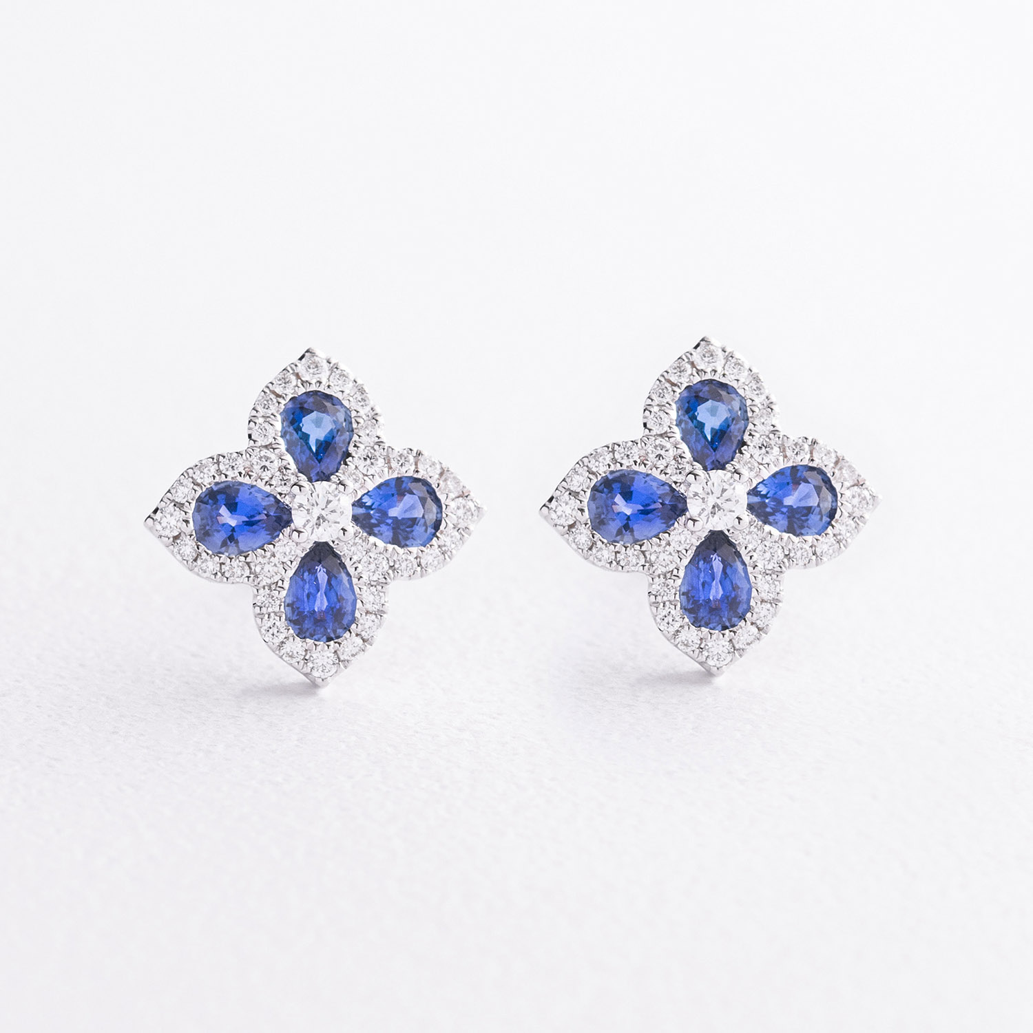 Сережки - пусети "Конюшина" в білому золоті (діаманти, сапфіри)